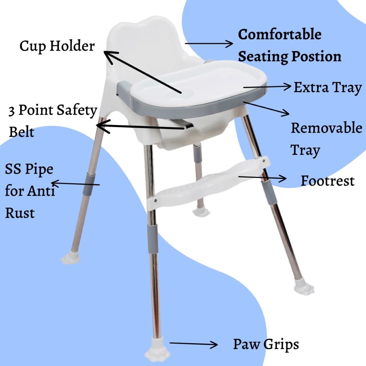 • 3 level adjustable table tray according to your baby’s height and convenience.