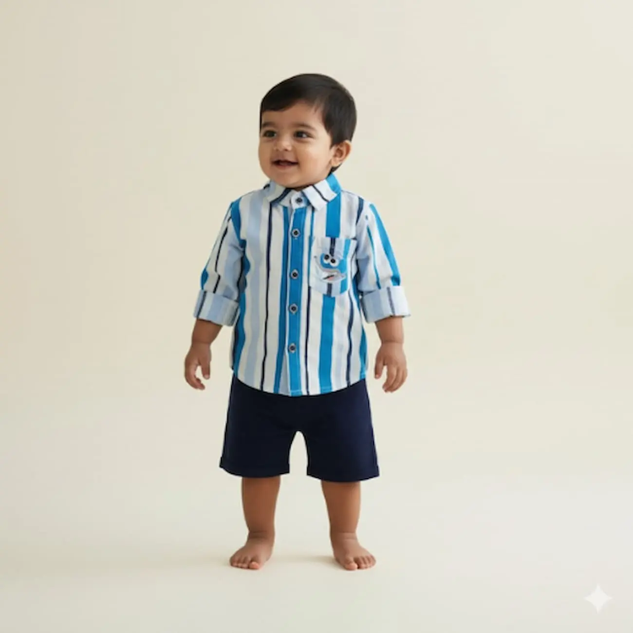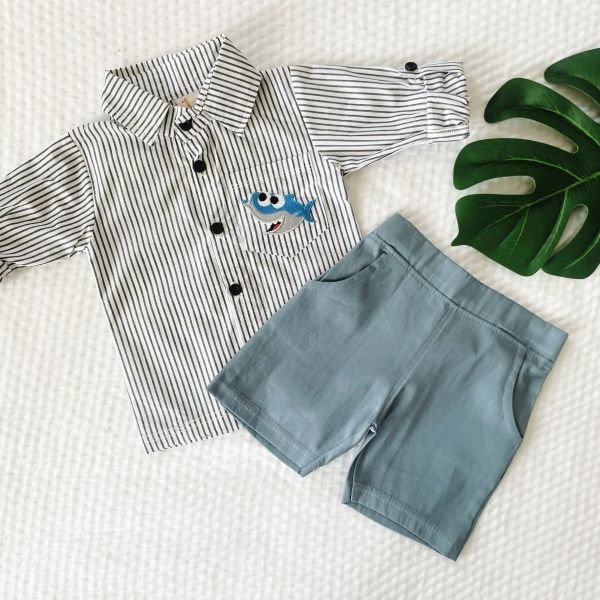 Dress your little one in style with our adorable Baby Shark Embroidery Set! Featuring a striped full-sleeve shirt with a charming Baby Shark embroidery on the pocket, paired with comfortable twill shorts. Perfect for any occasion, this outfit combines cuteness with comfort, ensuring your baby boy looks and feels great all day long.
