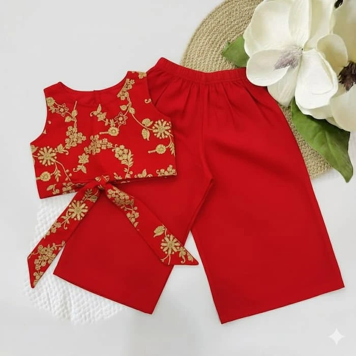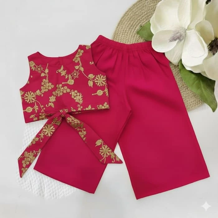 Dress your little one in timeless elegance with our Chanderi Bow Top & Palazzos set, crafted for festive charm and all-day comfort. The soft Chanderi fabric shimmers with a delicate sheen, while the airy palazzo pants ensure easy movement for playful moments.