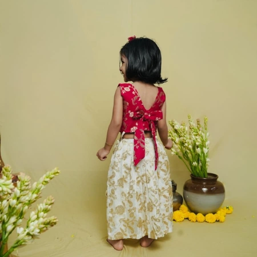 Bring the charm of blooms and tradition together with this delightful Chanderi Floral Top and Skirt set. Crafted in soft, airy Chanderi silk with delicate floral patterns, this outfit is perfect for your little one’s first Onam or festive celebrations.