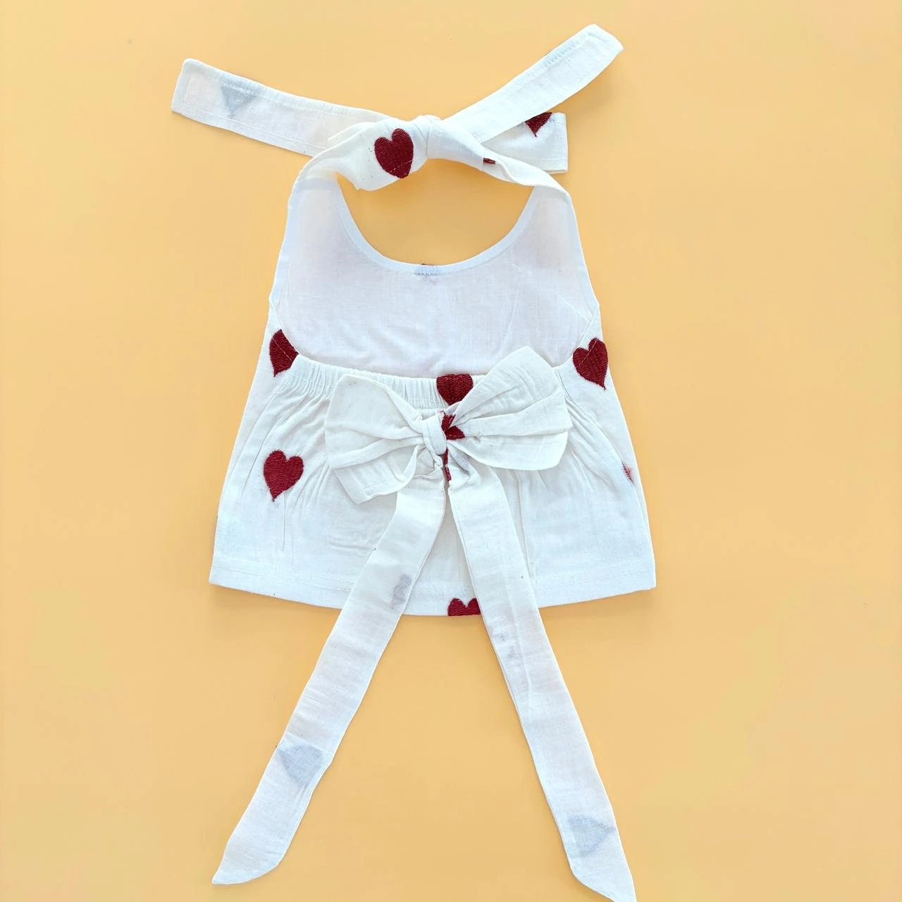 Dress your baby girl in timeless charm with our Khadi Hearts Tying Top & Skirt set. Handcrafted from 100% loin cotton lining, this breathable and ultra-soft outfit ensures all-day comfort.