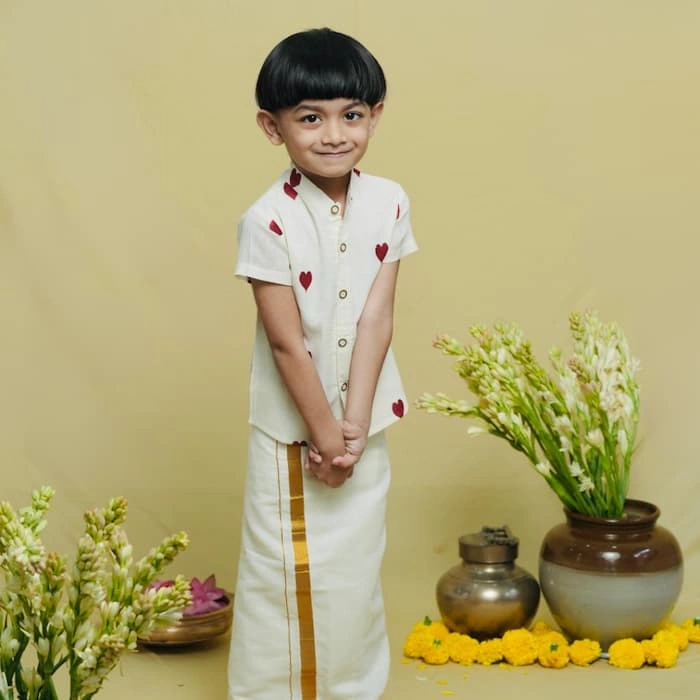 Dress your little one in timeless charm with our Khadi Hearts Embroidered Shirt & Velcro Mundu set. Crafted for comfort and tradition, this outfit blends heritage fabrics with modern ease, making it perfect for festive occasions and cultural celebrations.