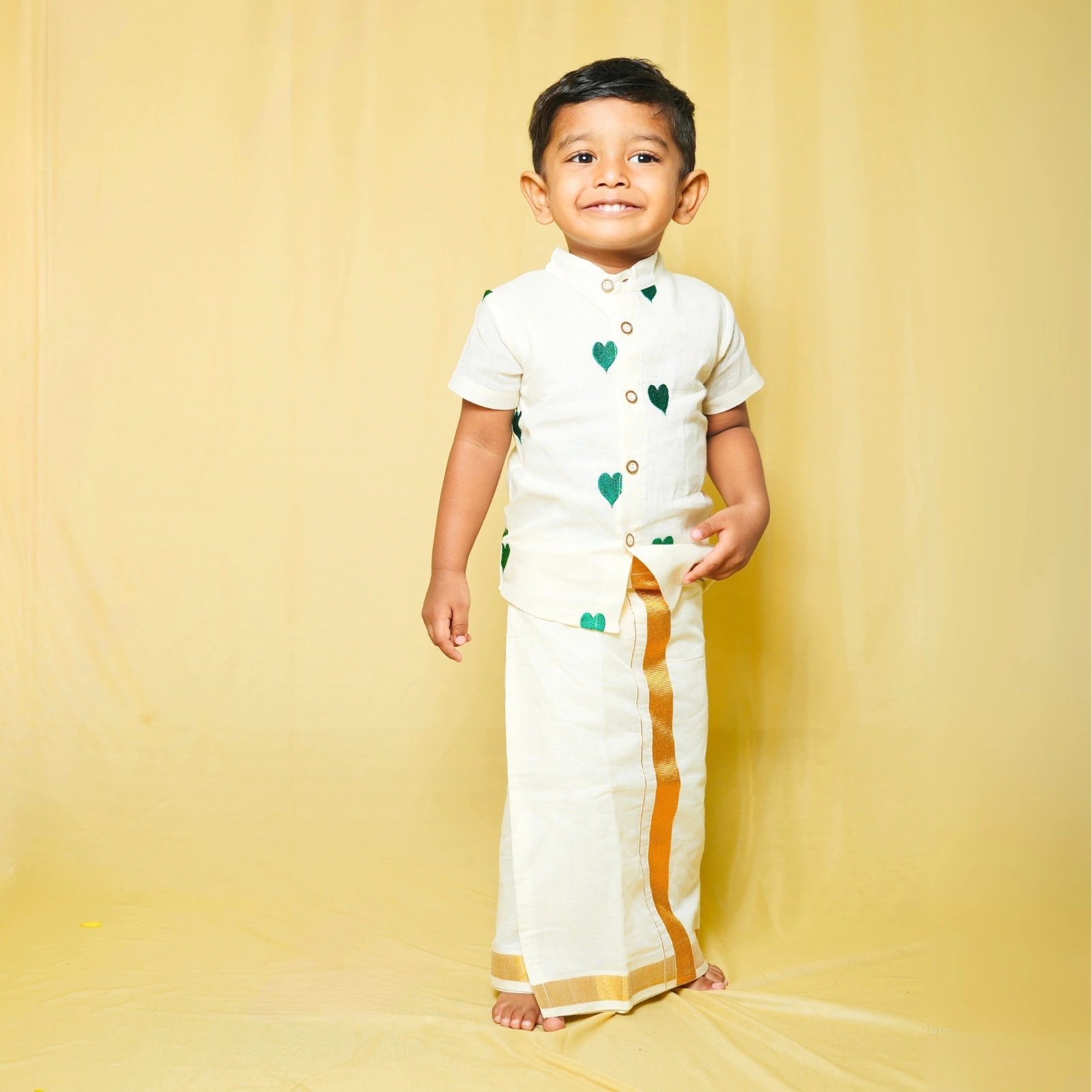 Khadi Hearts Embroidered Shirt & Velcro Mundu – Traditional Elegance for Little Boys
