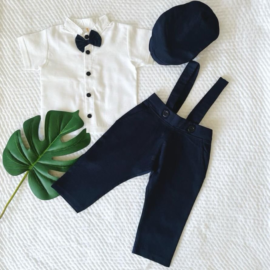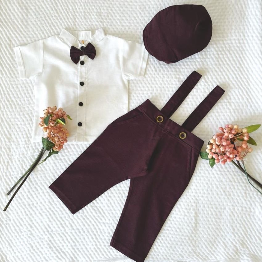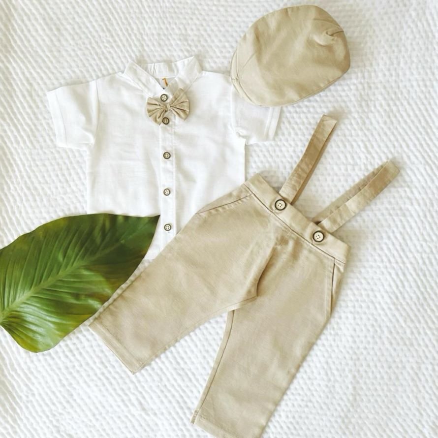 Introducing our Linen Pant Suspender & Shirt set, perfect for your little gentleman. This adorable ensemble includes a crisp white shirt with a charming bow tie and an ascot cap with a matching linen fabric, creating a coordinated look. The cap features an elastic for a snug fit and adds a touch of vintage charm to your baby boy’s outfit. The breathable and comfortable linen pants with adjustable suspenders complete the look. Your baby boy will look dapper and feel comfortable in this outfit, making it ideal for special occasions, family gatherings, or stylish everyday wear. Make your little one the best-dressed baby in town with this classic and fashionable attire, complete with a coordinating cap.