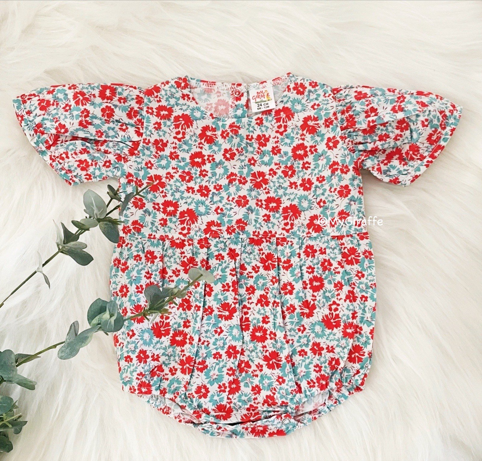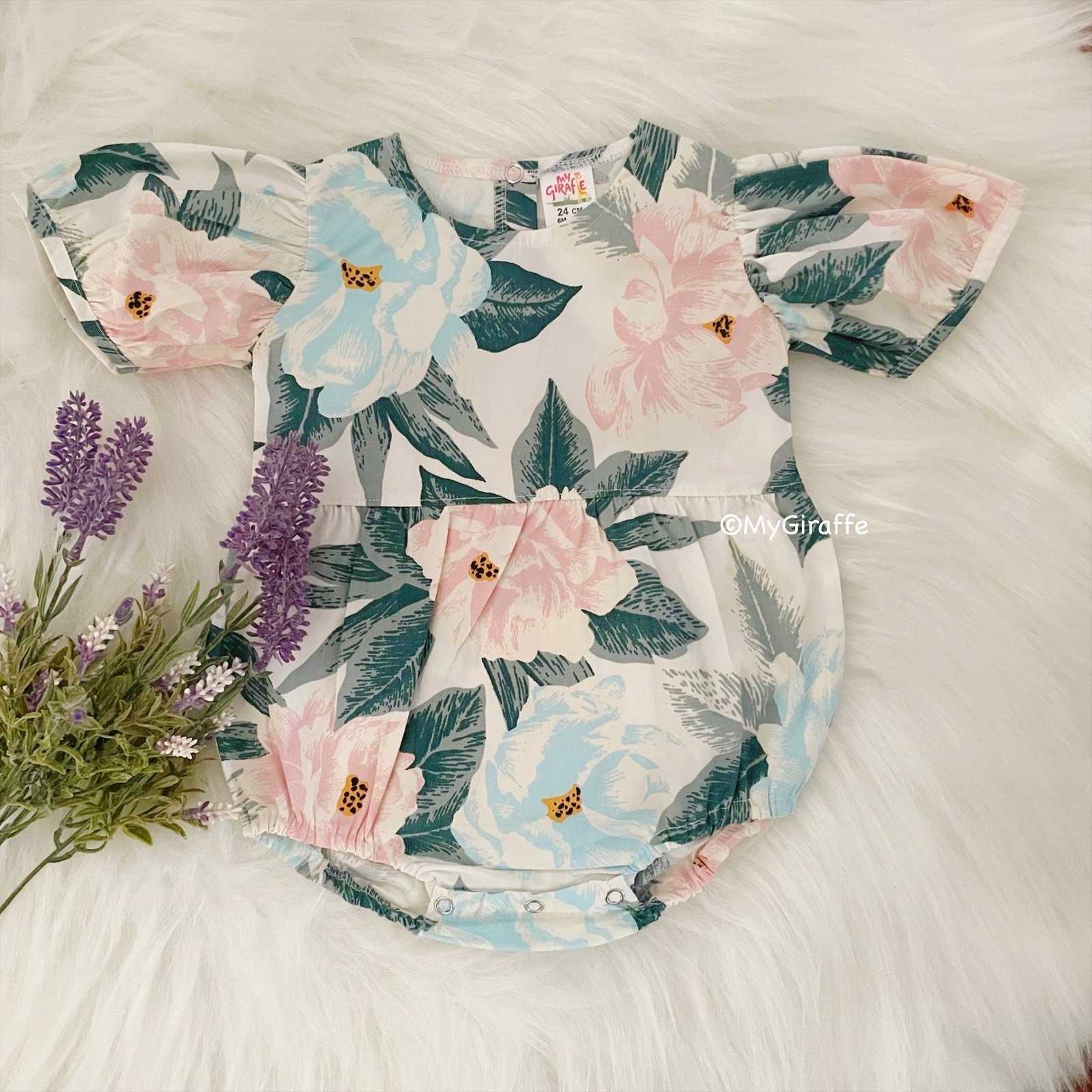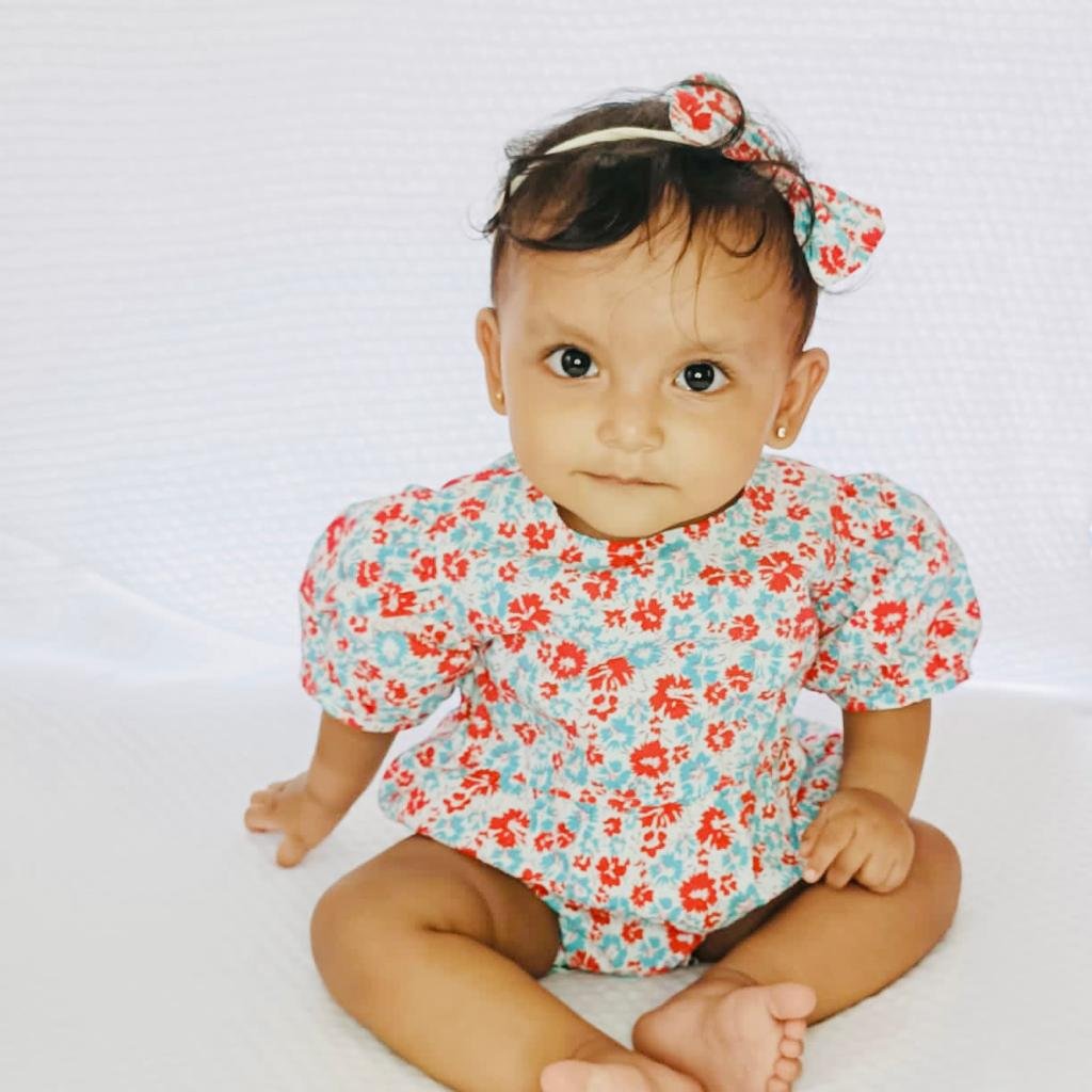 This volume sleeve onesie is comfortable and easy to wear. With snap buttons in the back and in the bottom for easy diaper changes. This onesie can be styled with stockings or any pair of bottoms too