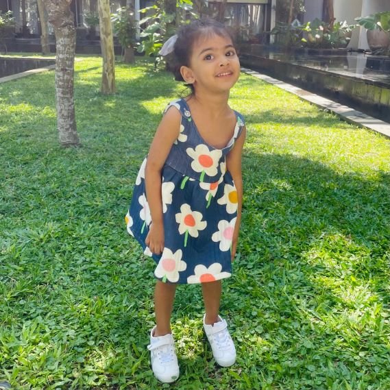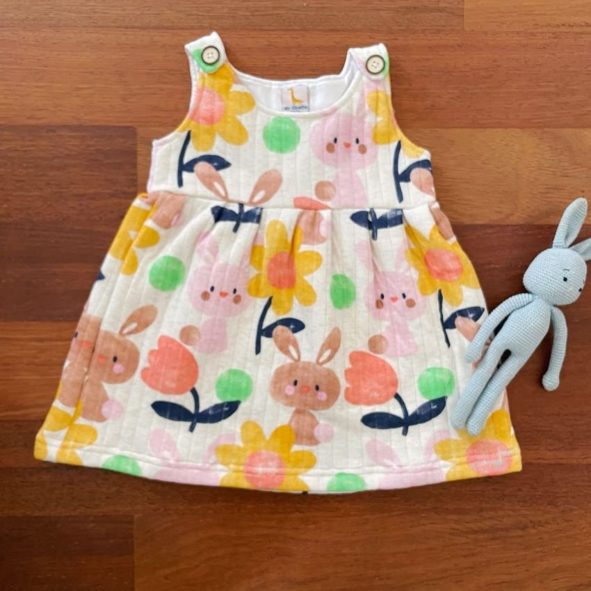 This adorable dress features a soft, quilted fabric with charming prints . It has wooden look alike buttons on the shoulders for easy dressing and a gathered skirt for comfortable movement. Perfect for everyday wear, special occasions, or photo shoots, it is machine washable and easy to care for.