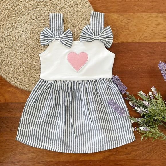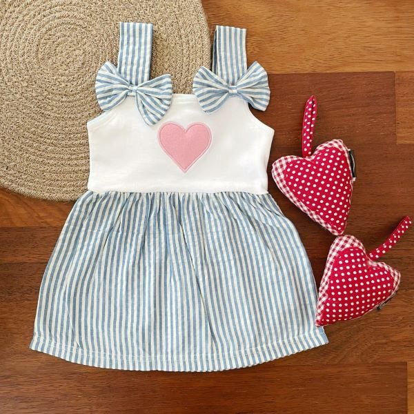 Elevate your little one’s charm with our seersucker striped dress. Adorned with heart embroidery and sweet bows on the shoulders, this baby girl’s dress is perfect for adorable moments. Explore timeless style and comfort on our website.
