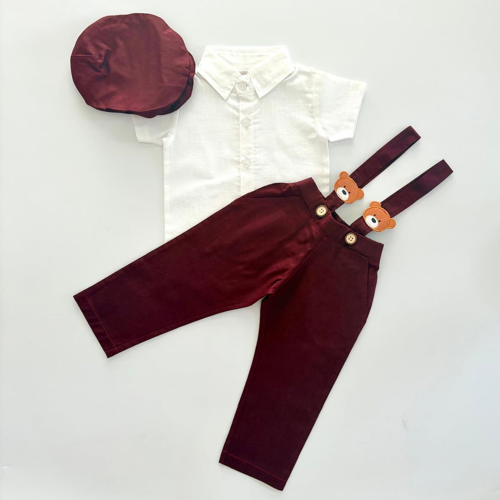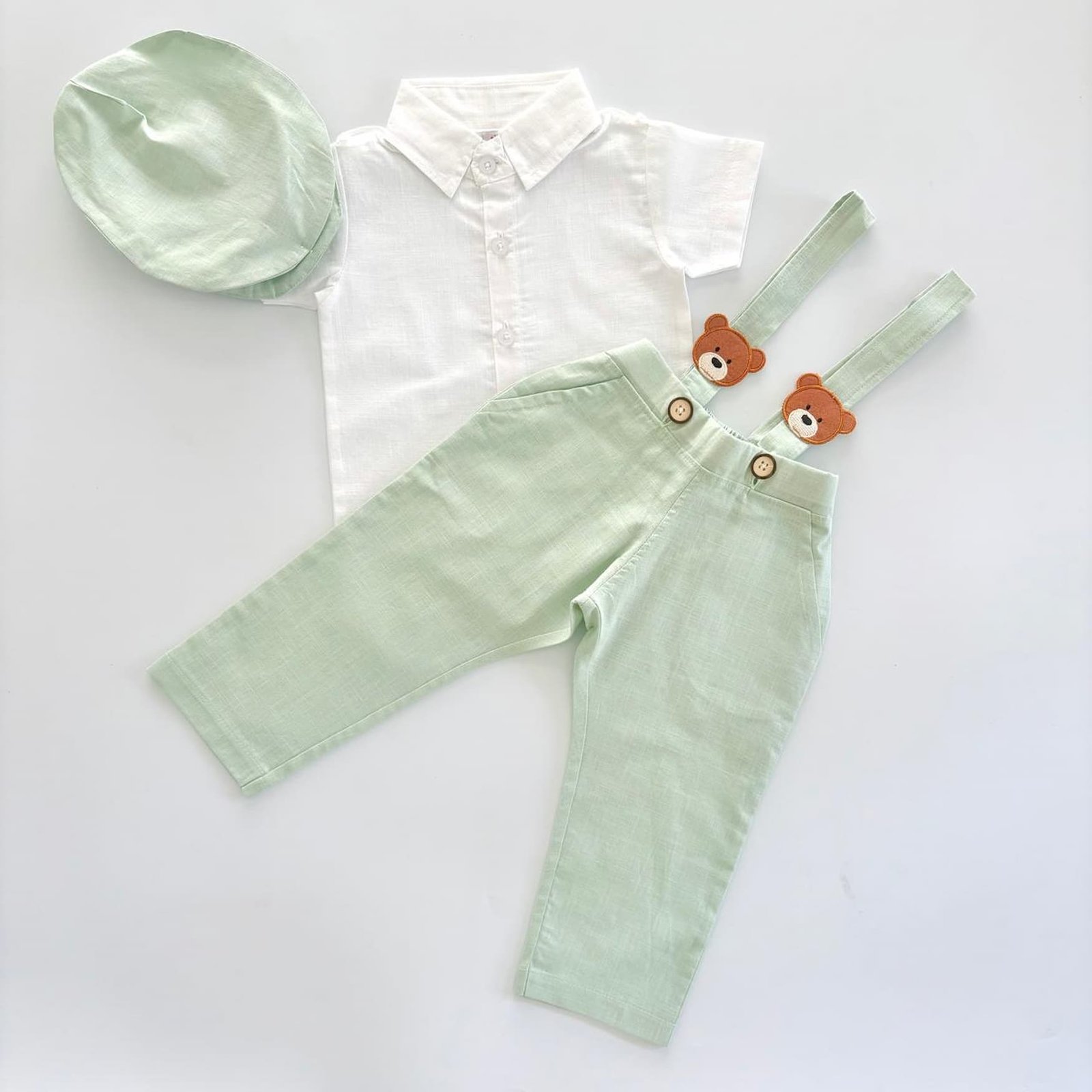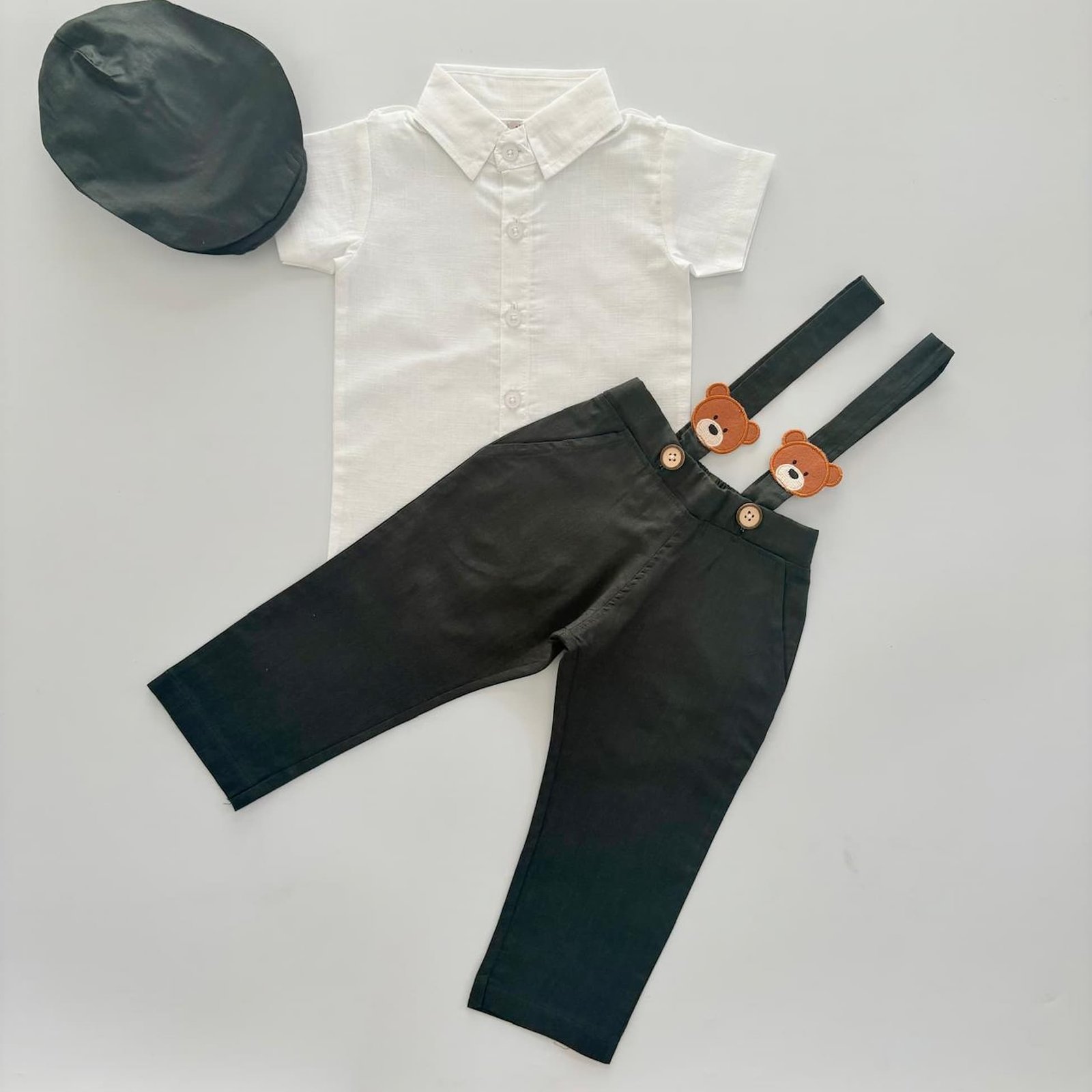 Dress your little one in comfort and style with this adorable Teddy Linen Pants Suspended and Shirt Set for baby boys. Crafted from soft, breathable linen, this set ensures your baby stays cool and comfortable, whether it’s for a special occasion or a casual day out.