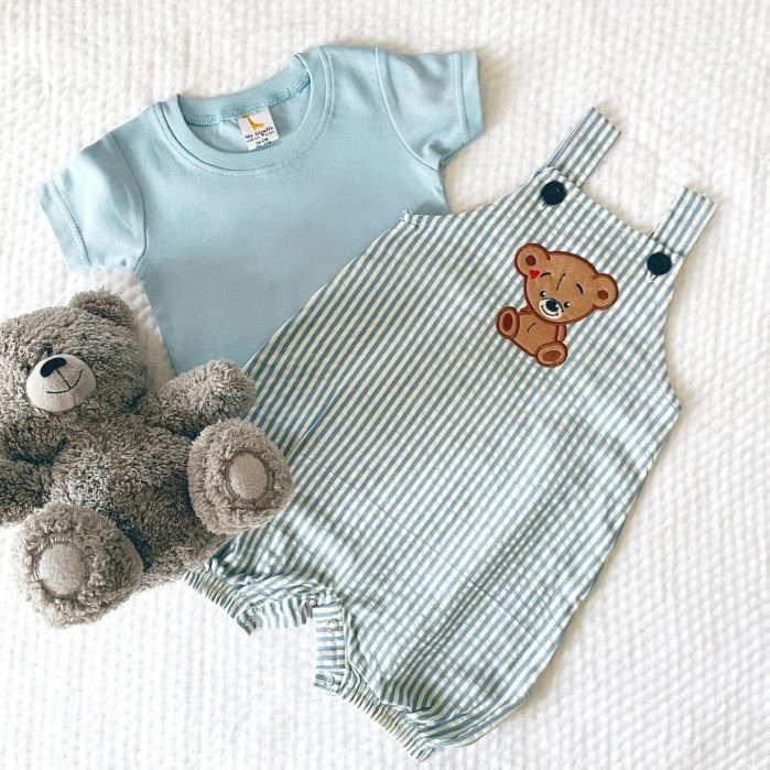 Elevate your baby boy’s style with our Seersucker Striped Romper featuring delightful teddy embroidery. Paired seamlessly with a soft interlock tee, this ensemble offers both charm and comfort. Crafted with attention to detail, it’s a must-have for your little one’s wardrobe, blending playful design with cozy wear.